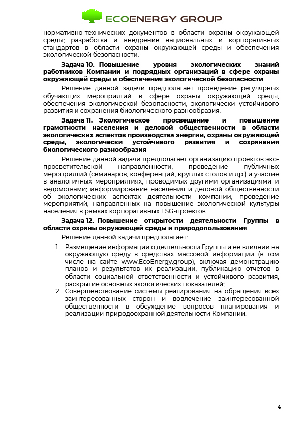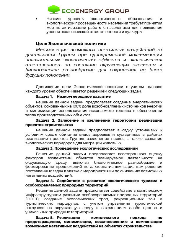 ESG-стратегия Группы формируется на основе Миссии, Стратегическом видении Группы, а также Социальной и Экологической политиках «EcoEnergy Group» и реализуется в рамках соответствующих социальных и экологических проектов