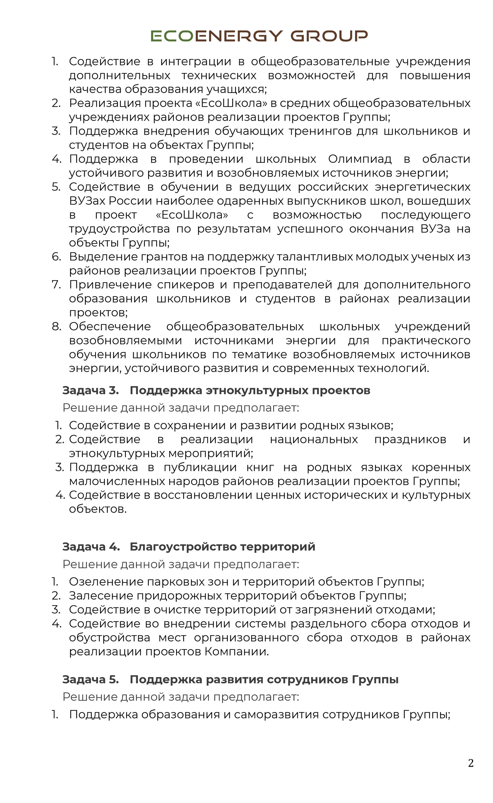 «EcoEnergy Group» видит своей миссией улучшение условий жизни и благосостояния населения регионов реализации проектов, а также сохранение условий среды обитания растений и животных, находящихся в зоне влияния объектов Группы, в т.ч. реализуемых совместно с партнерами.