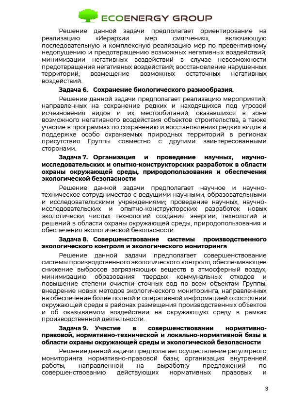 «EcoEnergy Group» видит своей миссией улучшение условий жизни и благосостояния населения регионов реализации проектов, а также сохранение условий среды обитания растений и животных, находящихся в зоне влияния объектов Группы, в т. ч. реализуемых совместно с партнерами.
