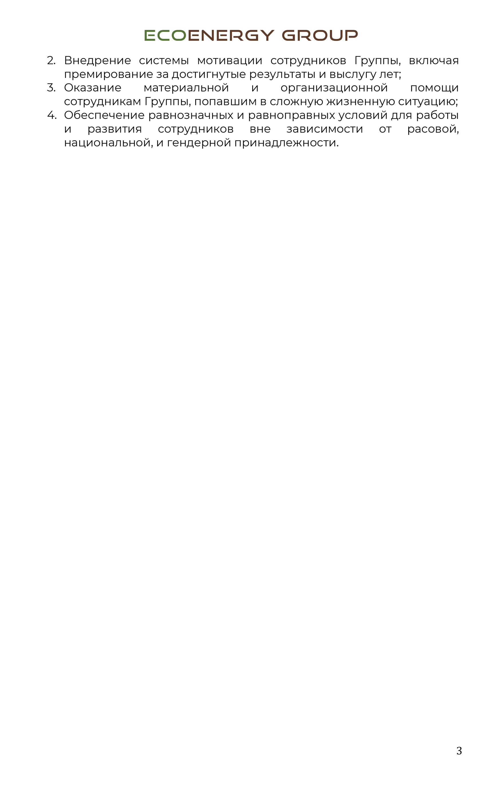 «EcoEnergy» считает своим стратегическим приоритетом высокую социальную и экологическую ответственностю как перед населением, так и перед своими сотрудниками, интегрируя ESG-показатели в Стратегические целевые результаты развития Группы до 2025 года. Интеграция ESG-принципов осуществляется как в рамках проектов Группы, так и на уровне корпоративного управления, являясь неотъемлемой частью корпоративной культуры и ценностей Группы.